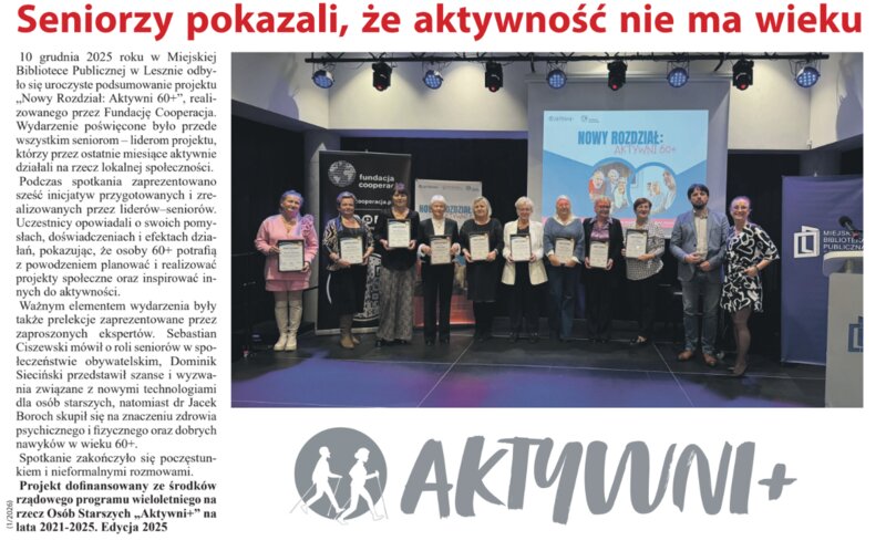 W najnowszym numerze „Leszczyniaka” (strona 4) znajdziecie relację z uroczystego podsumowania projektu „Nowy Rozdział: Aktywni 60+”, które odbyło się 10 grudnia 2025 roku w Miejskiej Bibliotece Publicznej w Lesznie.