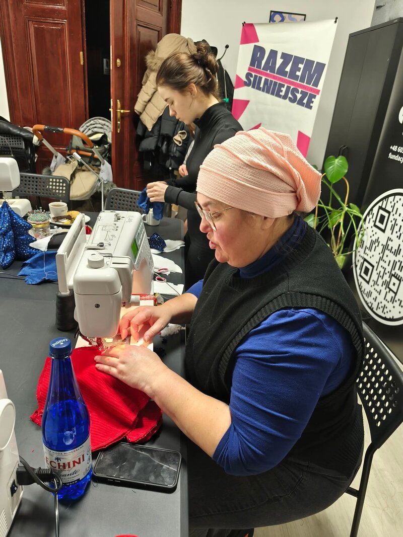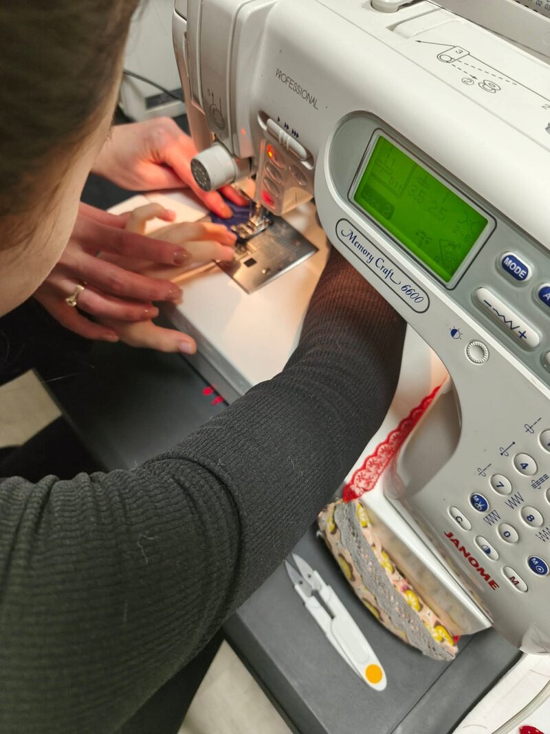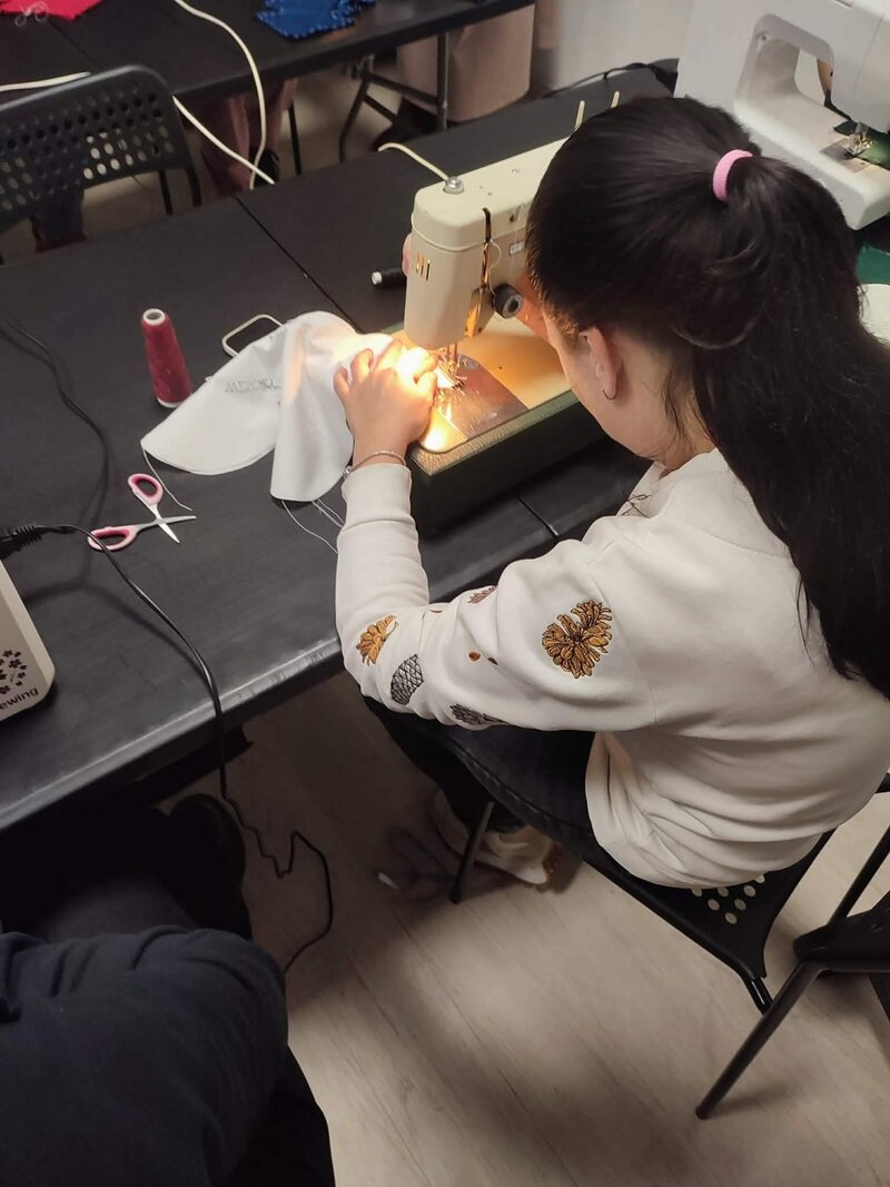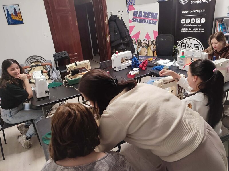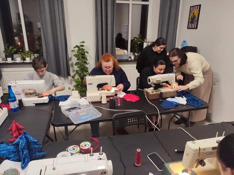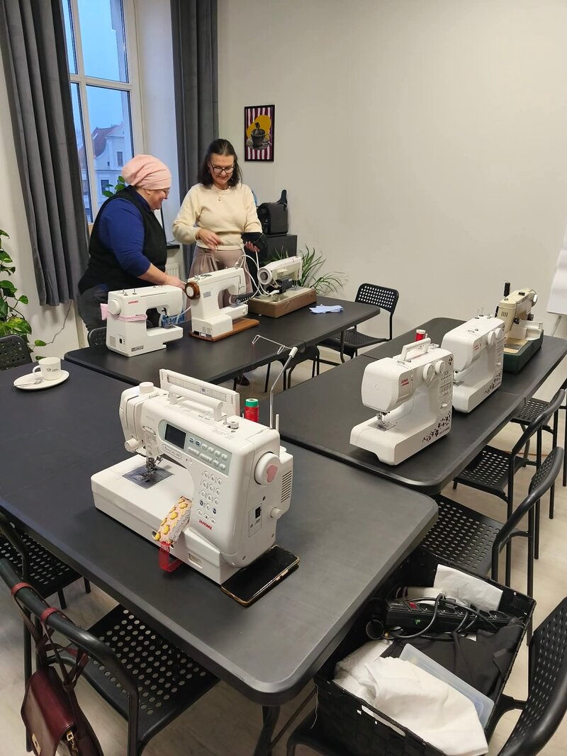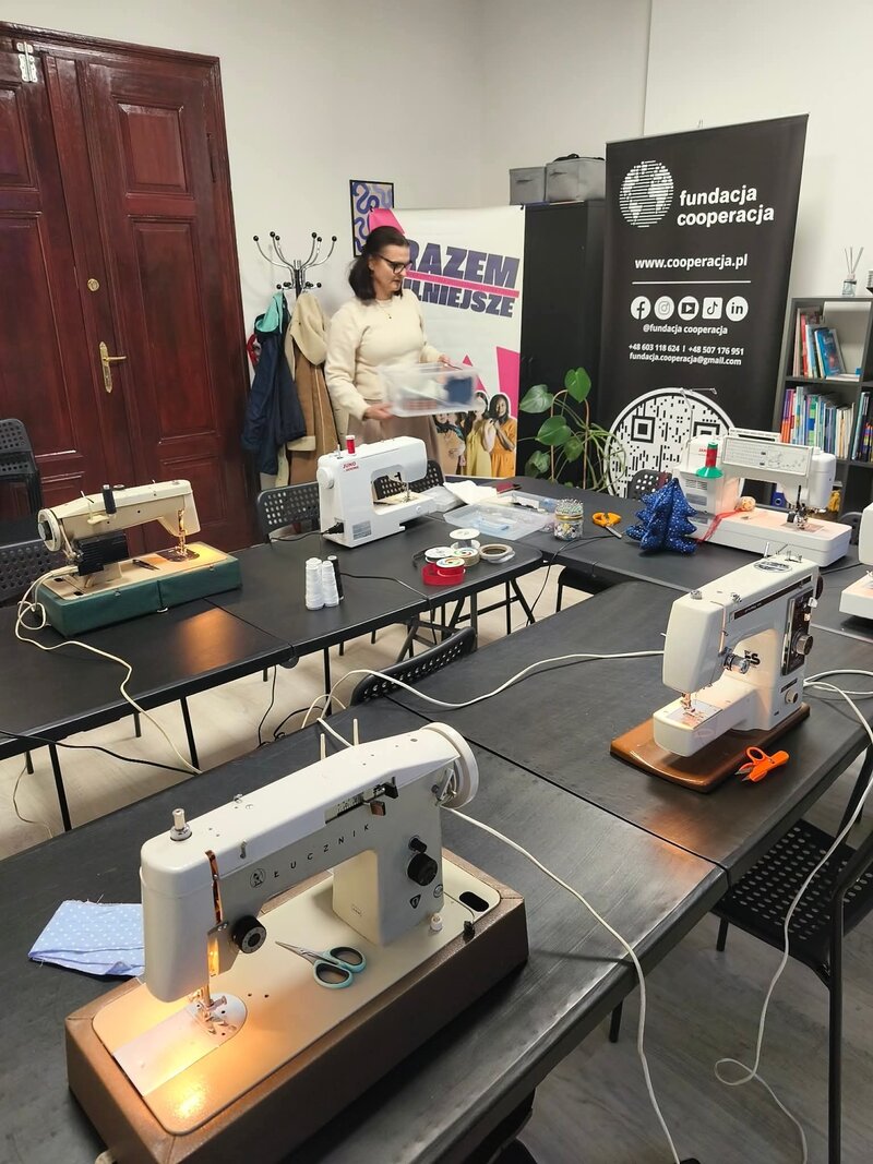 Praca przy maszynach szybko stała się okazją do budowania bliskich, sąsiedzkich relacji. Pojawiły się rozmowy o tradycjach, codzienności, a także o tym, jak wiele nas łączy mimo różnych języków i kultur. Warsztaty były przestrzenią integracji, uważności i wzajemnego wsparcia – dokładnie taką, jaką chcieliśmy stworzyć w tym projekcie.