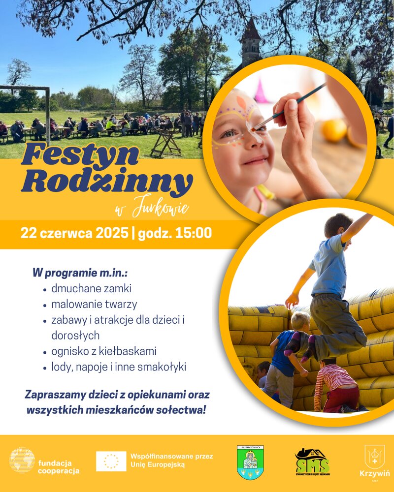 Już w niedzielę, 22 czerwca 2025 r., od godziny 15:00 na placu przy świetlicy wiejskiej w Jurkowie odbędzie się Festyn Rodzinny dla wszystkich mieszkańców sołectwa. Wydarzenie organizowane jest w ramach projektu „Energia Pokoleń – tradycje na nowo”, którego celem jest wzmacnianie więzi międzypokoleniowych oraz pielęgnowanie lokalnych tradycji poprzez wspólne działania.