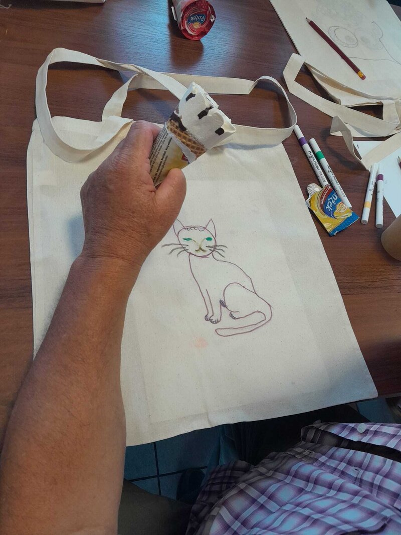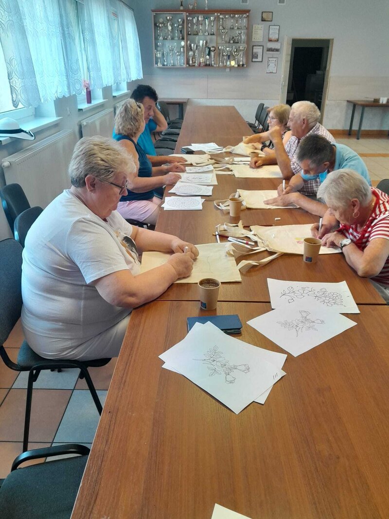 Główną atrakcją było malowanie bawełnianych toreb – każdy mógł stworzyć swój własny, niepowtarzalny wzór. Powstawały kwiatowe kompozycje, a nawet małe dzieła sztuki inspirowane lokalnym krajobrazem. Atmosfera była swobodna – uczestnicy rozmawiali, dzielili się wspomnieniami i pomysłami, a przy wspólnym stole pachniała kawa i domowe ciasto.