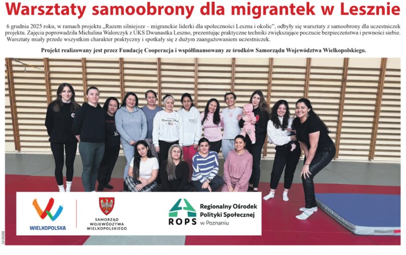 W najnowszym numerze „Leszczyniaka” (strona 6) znajdziecie artykuł poświęcony warsztatom samoobrony dla migrantek, które odbyły się 6 grudnia 2025 roku w Lesznie.