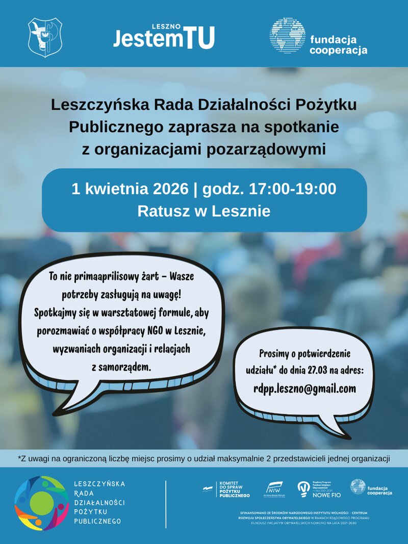 Leszczyńska Rada Działalności Pożytku Publicznego zaprasza przedstawicieli organizacji pozarządowych działających na terenie miasta Leszna na otwarte spotkanie, które odbędzie się 1 kwietnia 2026 r. w godz. 17:00–19:00 w leszczyńskim Ratuszu.