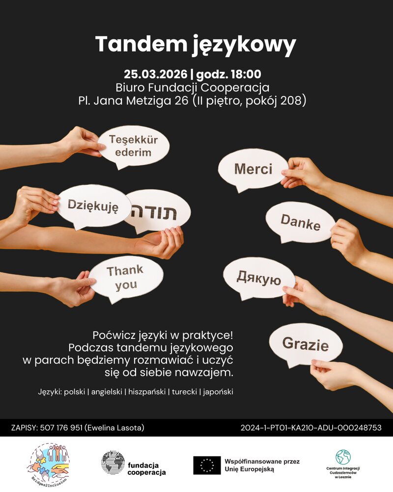 Zapraszamy na spotkanie tandemu językowego, które odbędzie się 25 marca 2026 r. o godz. 18:00 w Biurze Fundacji Cooperacja (Pl. Jana Metziga 26, II piętro, pokój 208).