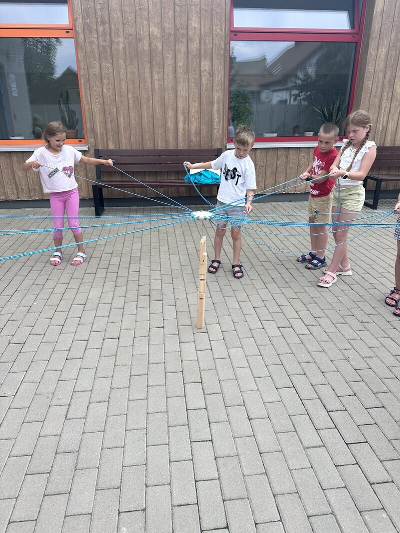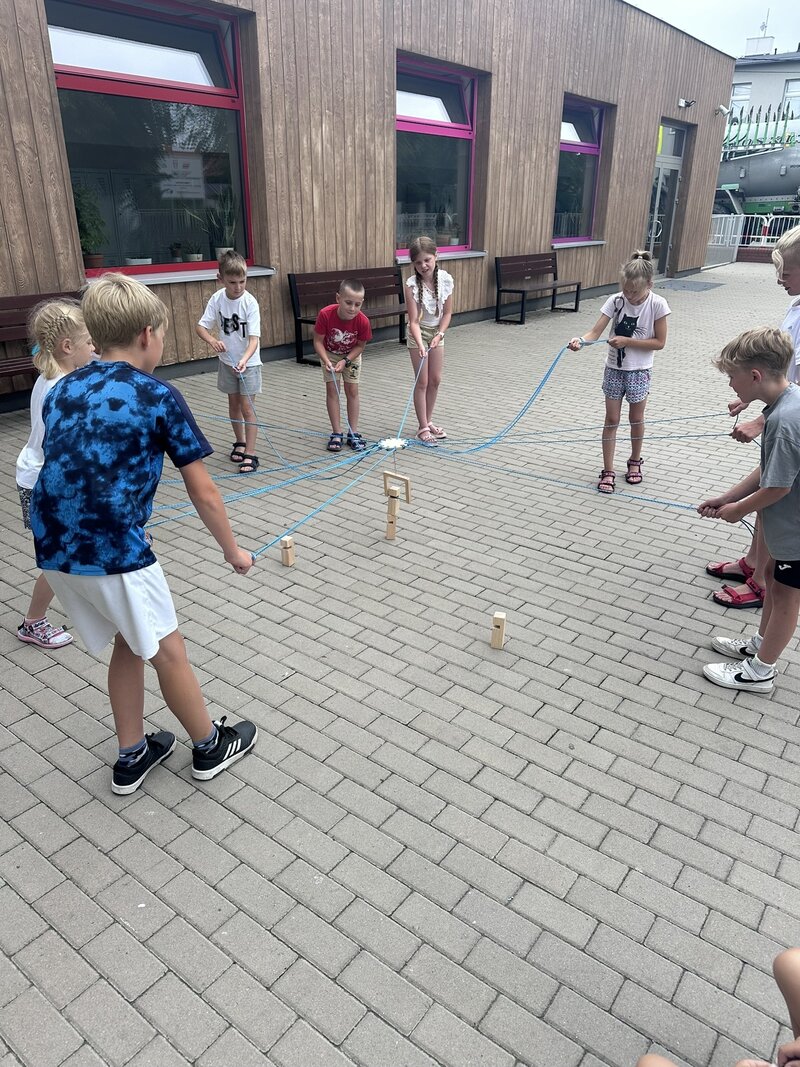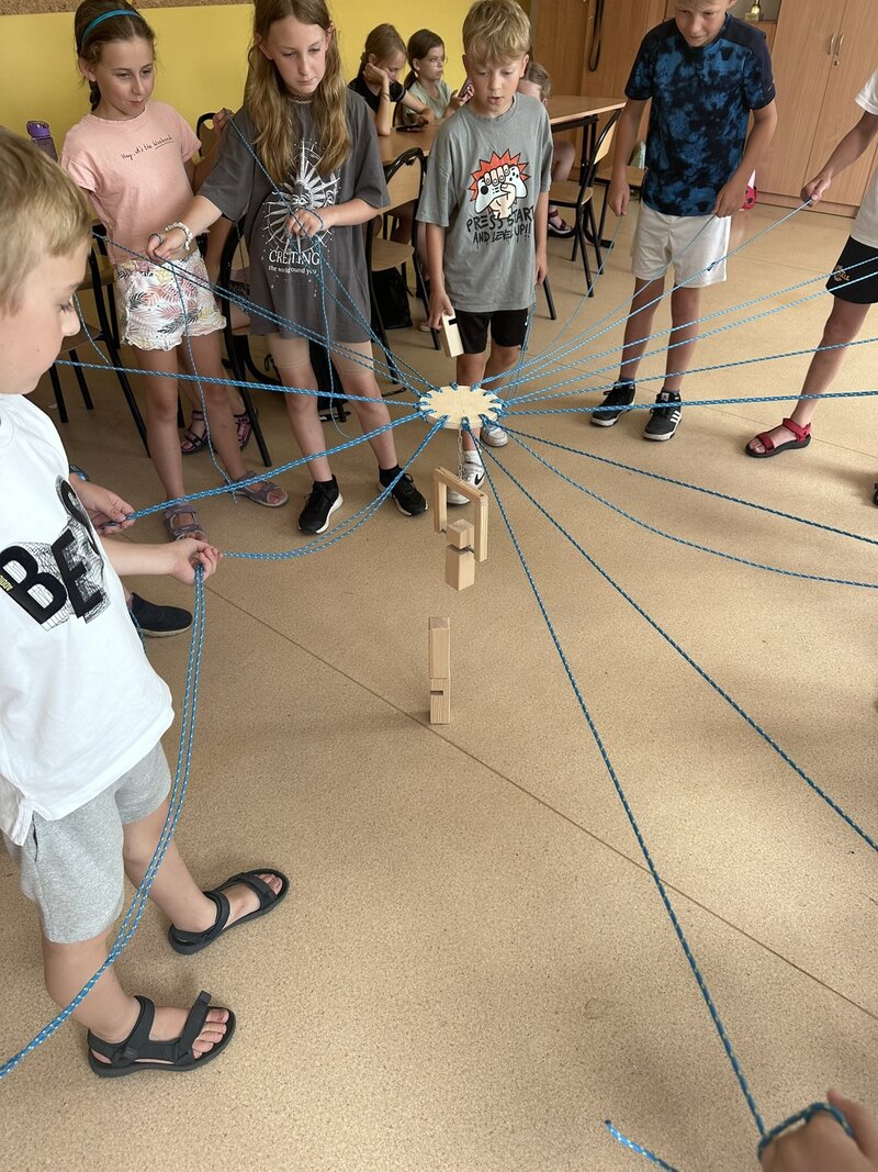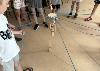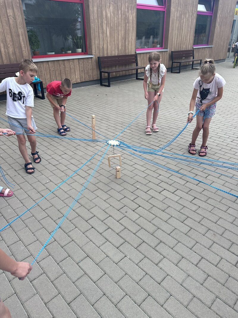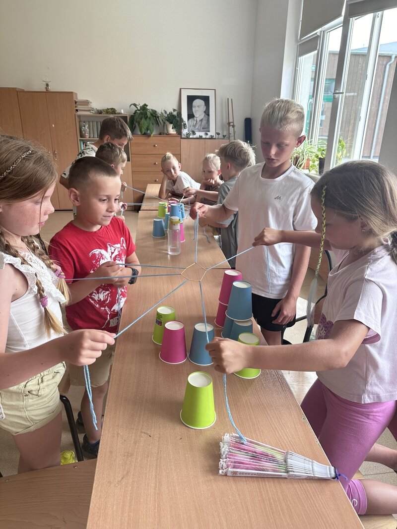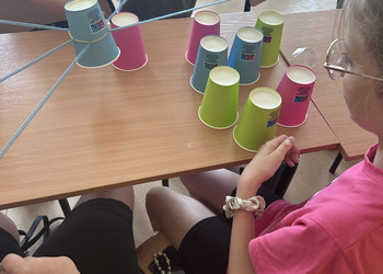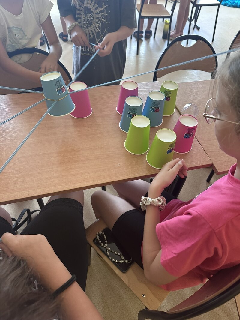 Następnie przeszliśmy do wyzwań związanych z budowaniem wież z kubków papierowych, bez użycia rąk, gdzie dzieci, korzystając z gumek recepturek i sznurków, musiały współpracować, aby osiągnąć wspólny cel. To ćwiczenie nie tylko rozwijało ich umiejętności techniczne, ale także wzmacniało współpracę i komunikację w grupie.