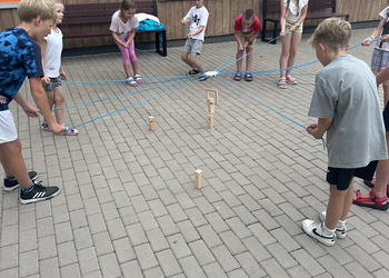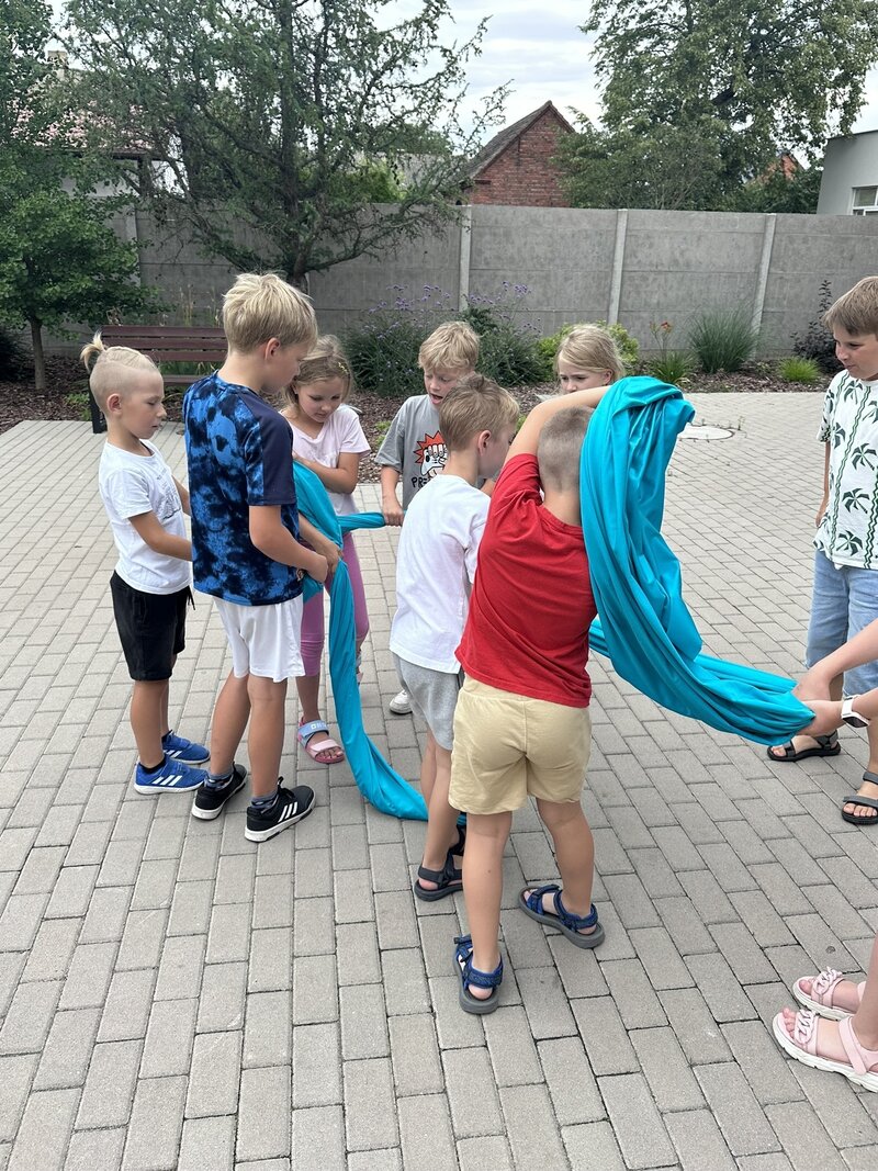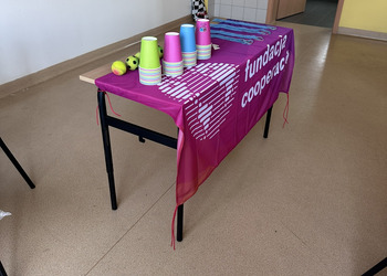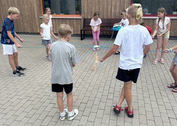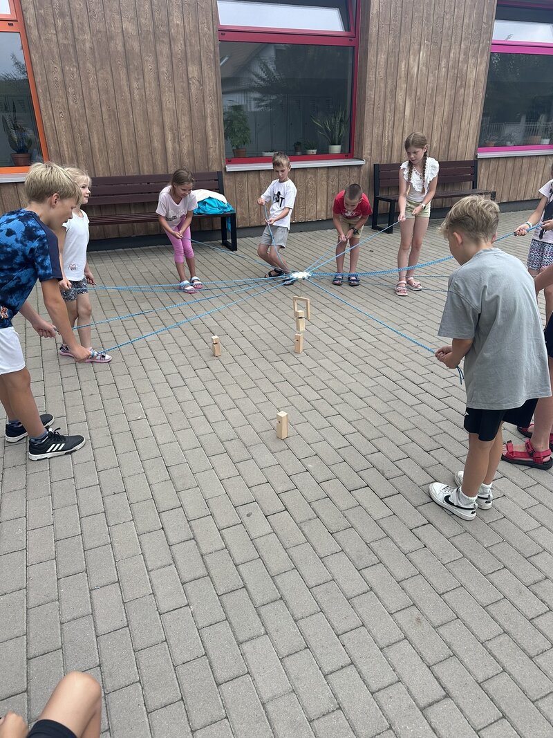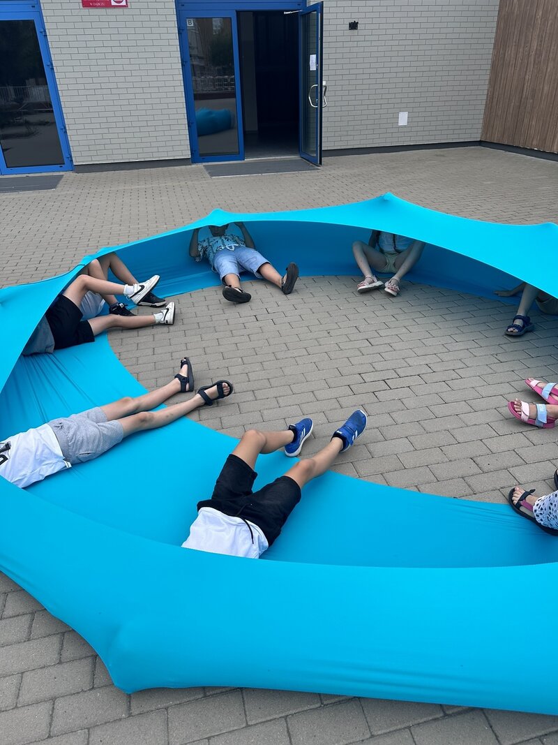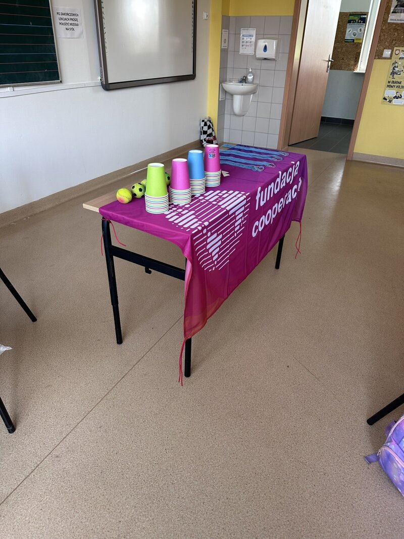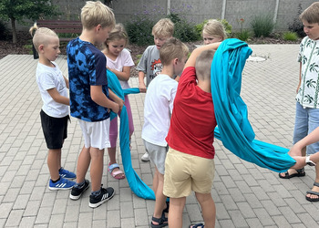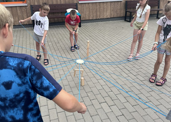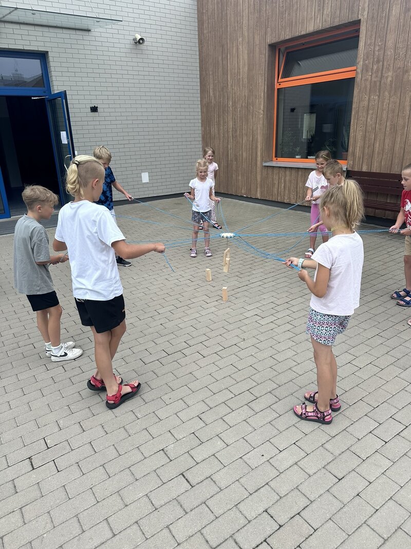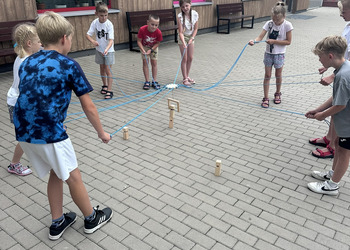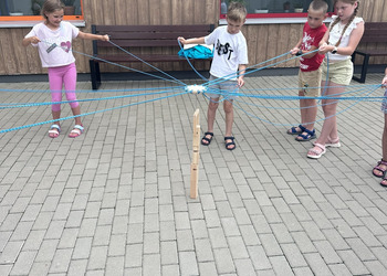 Następnie przeszliśmy do wyzwań związanych z budowaniem wież z kubków papierowych, bez użycia rąk, gdzie dzieci, korzystając z gumek recepturek i sznurków, musiały współpracować, aby osiągnąć wspólny cel. To ćwiczenie nie tylko rozwijało ich umiejętności techniczne, ale także wzmacniało współpracę i komunikację w grupie.