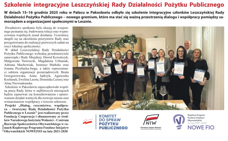 W najnowszym numerze „Leszczyniaka” (strona 8) możecie przeczytać o szkoleniu integracyjnym członków Leszczyńskiej Rady Działalności Pożytku Publicznego, które odbyło się w dniach 15–16 grudnia 2025 roku w Pałacu w Pakosławiu.