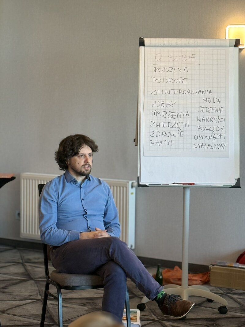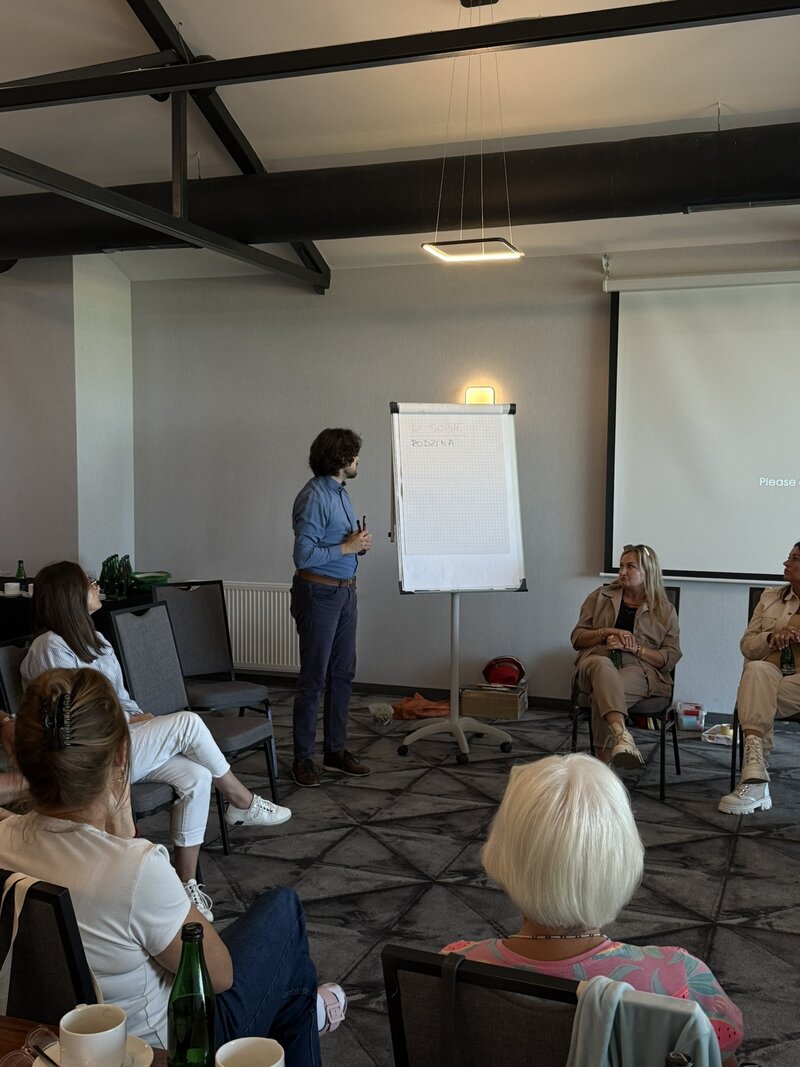Drugiego dnia uczestnicy skupili się na odkrywaniu i wzmacnianiu swoich mocnych stron. Dzięki narzędziu „koło życia” każdy mógł przyjrzeć się poziomowi satysfakcji w różnych obszarach swojego życia i zastanowić się nad kierunkami rozwoju. Kolejnym krokiem było tworzenie pierwszych pomysłów na własne działania społeczne – uczestnicy dzielili się inspiracjami i wizjami, które wkrótce przerodzą się w konkretne inicjatywy. Szkolenie zakończyło się krótką ewaluacją oraz wstępnym podziałem na grupy, które będą kontynuować pracę nad swoimi projektami.