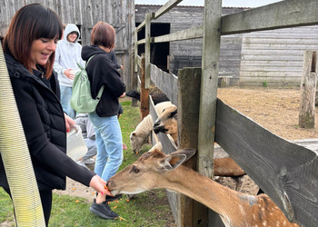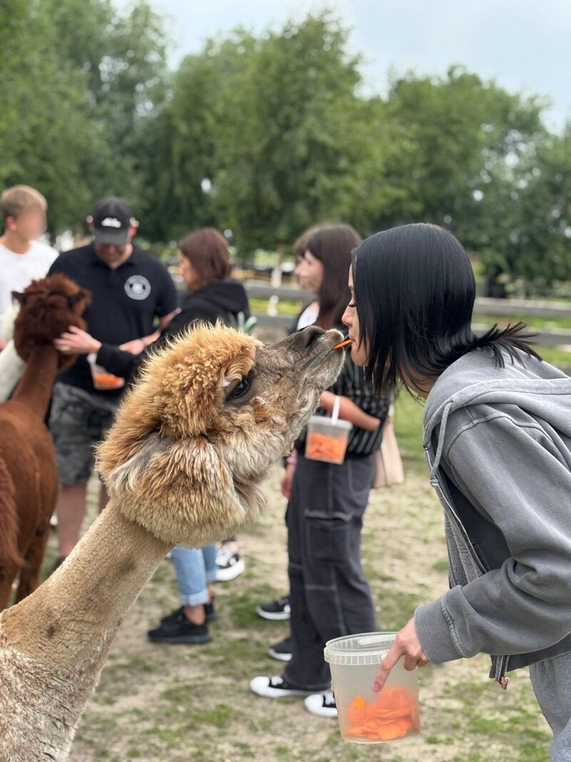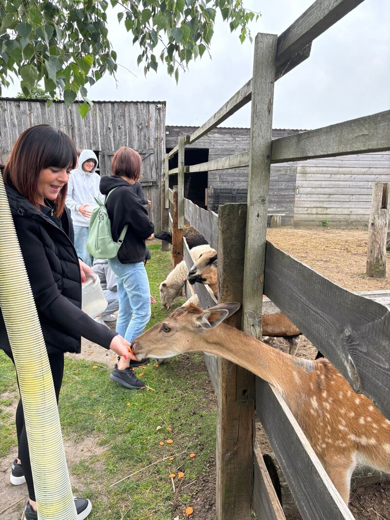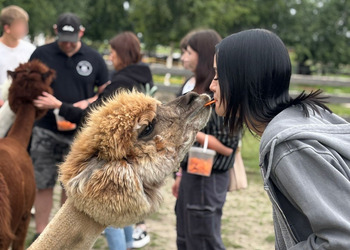 Spacer po Alpakomanii w towarzystwie alpak, osiołków, owieczek, baranków, kóz i danieli był dla wielu uczestników pierwszym tak bliskim kontaktem z tymi zwierzętami. To właśnie obcowanie z przyrodą i kontakt ze zwierzętami sprzyjało wyciszeniu, refleksji i integracji grupy w sposób naturalny, niewymuszony.