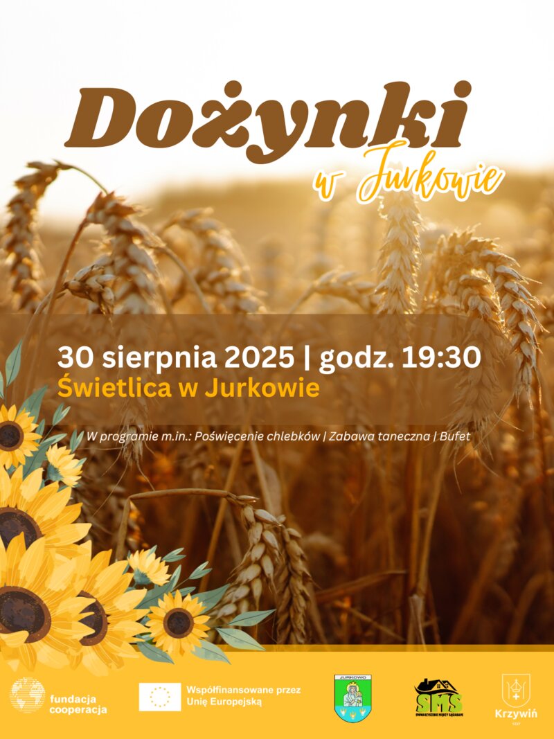 Już w sobotę, 30 sierpnia o godz. 19:30, serdecznie zapraszamy wszystkich mieszkańców Jurkowa i okolicznych miejscowości do wspólnego świętowania Dożynek, które odbędą się w sali wiejskiej w Jurkowie.