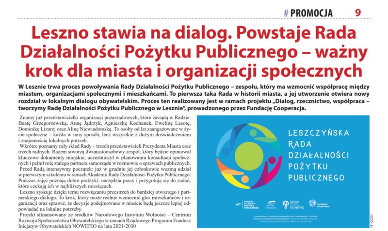 W najnowszym, grudniowym wydaniu gazety Leszczyniak (strona 9) można przeczytać artykuł o ważnym dla naszego miasta kroku – powołaniu Leszczyńskiej Rady Działalności Pożytku Publicznego. To pierwsza taka Rada w historii Leszna, która ma wzmocnić współpracę pomiędzy samorządem, organizacjami społecznymi i mieszkańcami.