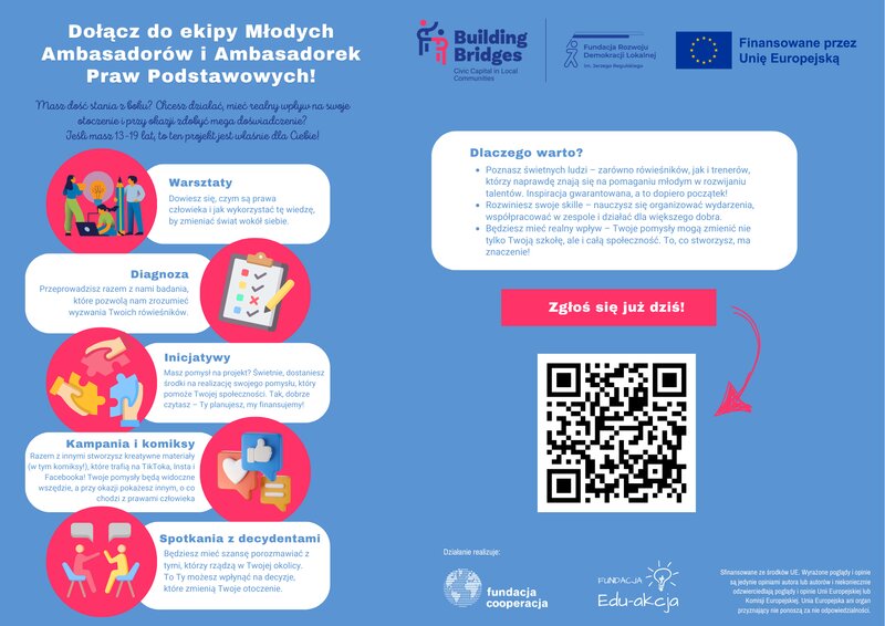 Masz 13-19 lat i chcesz mieć realny wpływ na to, co dzieje się wokół Ciebie? Szukasz sposobu, by zdobyć nowe umiejętności, poznać ludzi z pasją i działać na rzecz swojego otoczenia? Nasz projekt "Młodzi Ambasadorzy i Ambasadorki Praw Podstawowych" to idealna okazja, aby zacząć działać i wspólnie tworzyć lepszą przyszłość!
