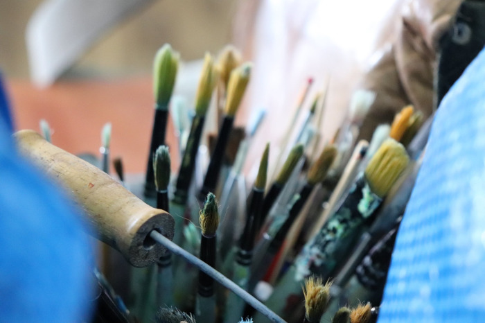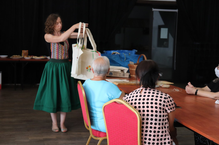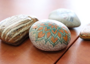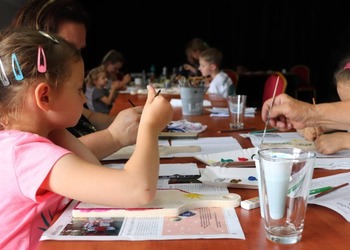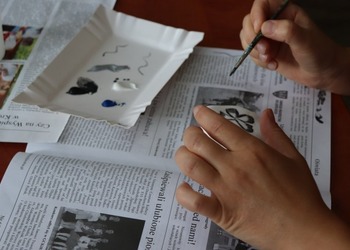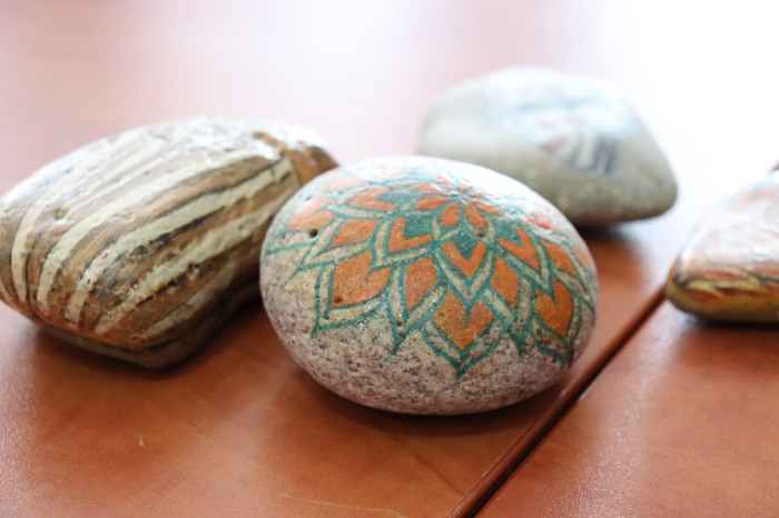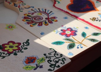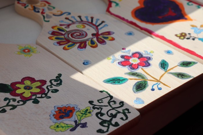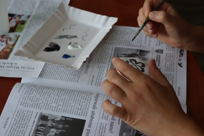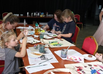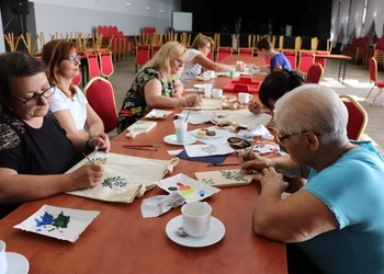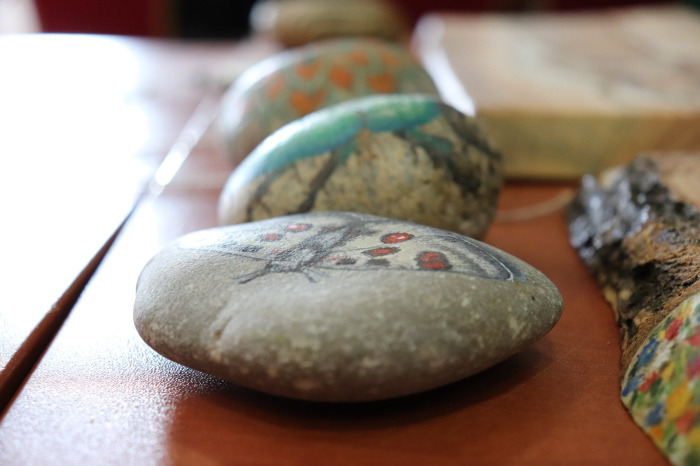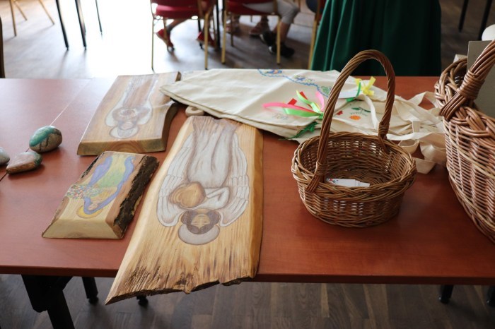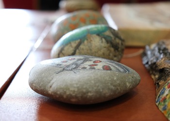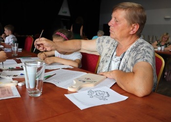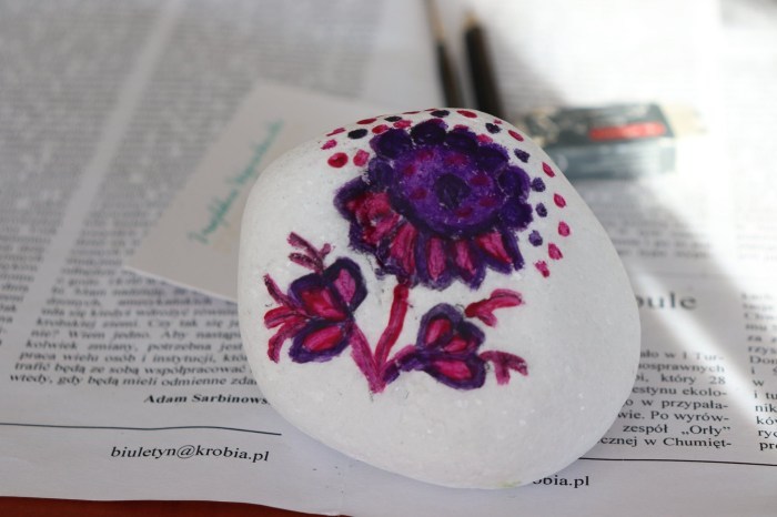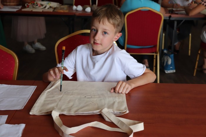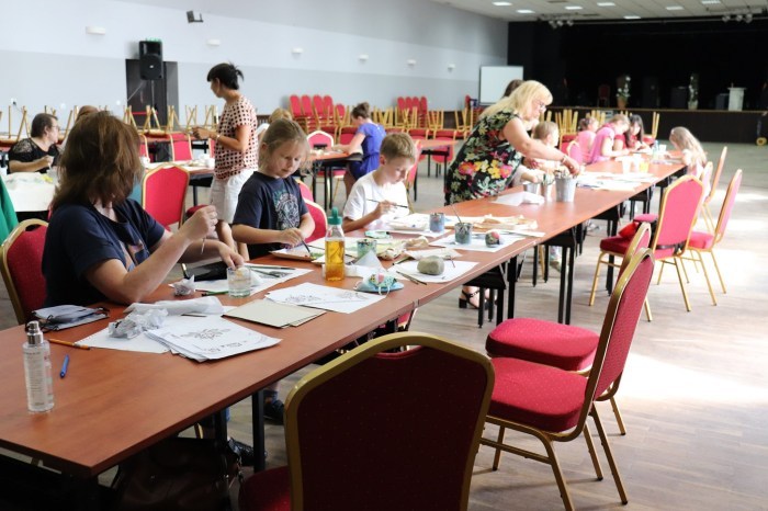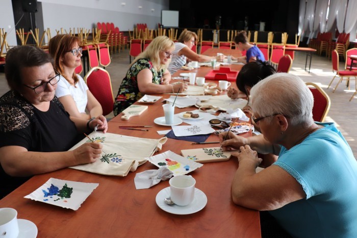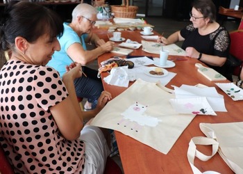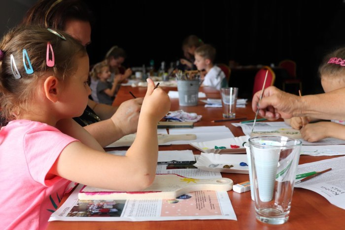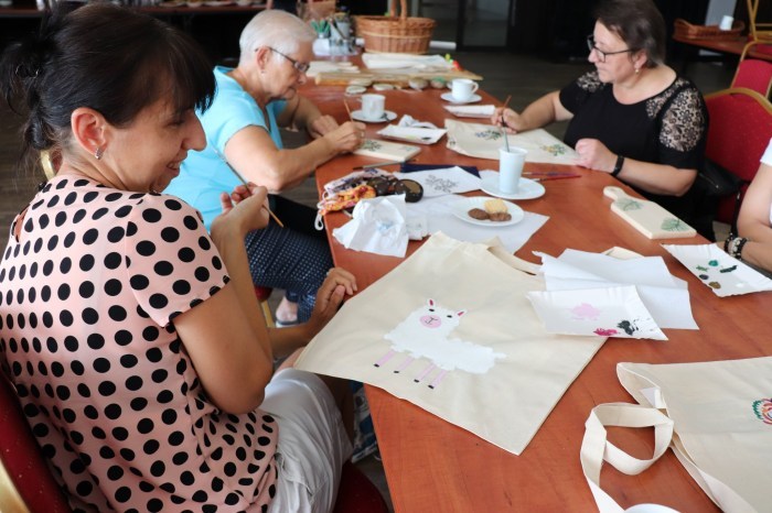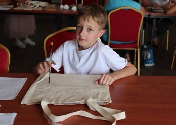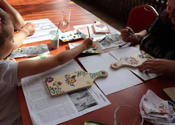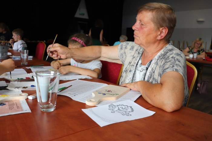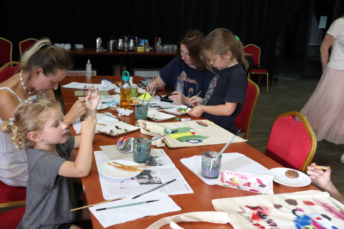Podczas pierwszych warsztatów w ruch poszły pędzle. Uczestnicy oddali się przyjemności malowania na różnych powierzchniach – do wyboru były torby bawełniane, kamienie oraz deski do krojenia chleba.