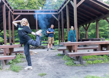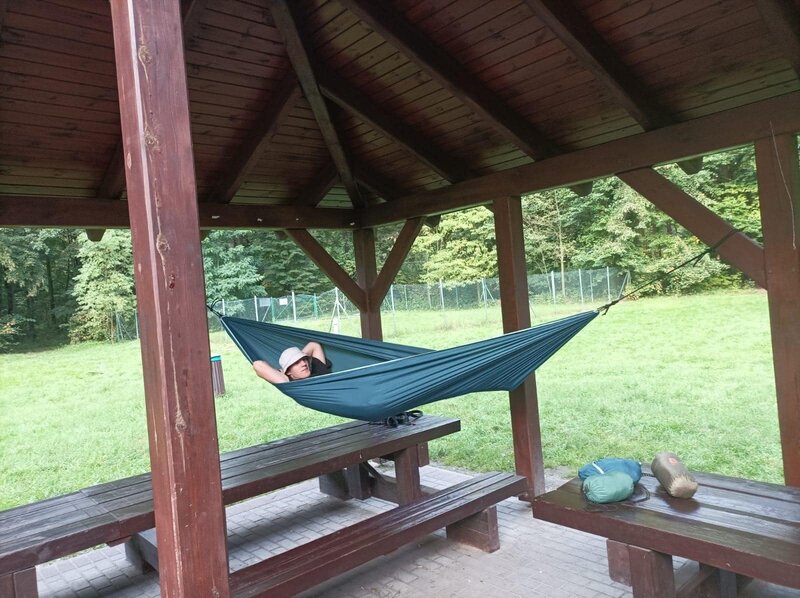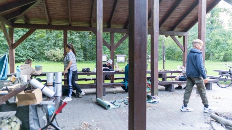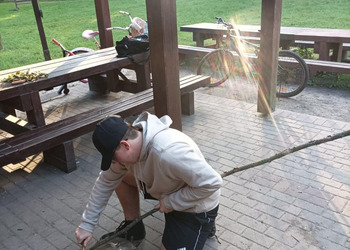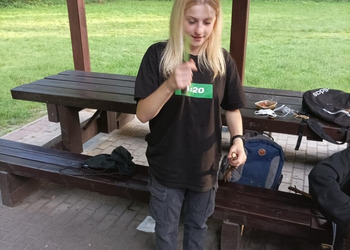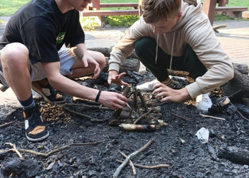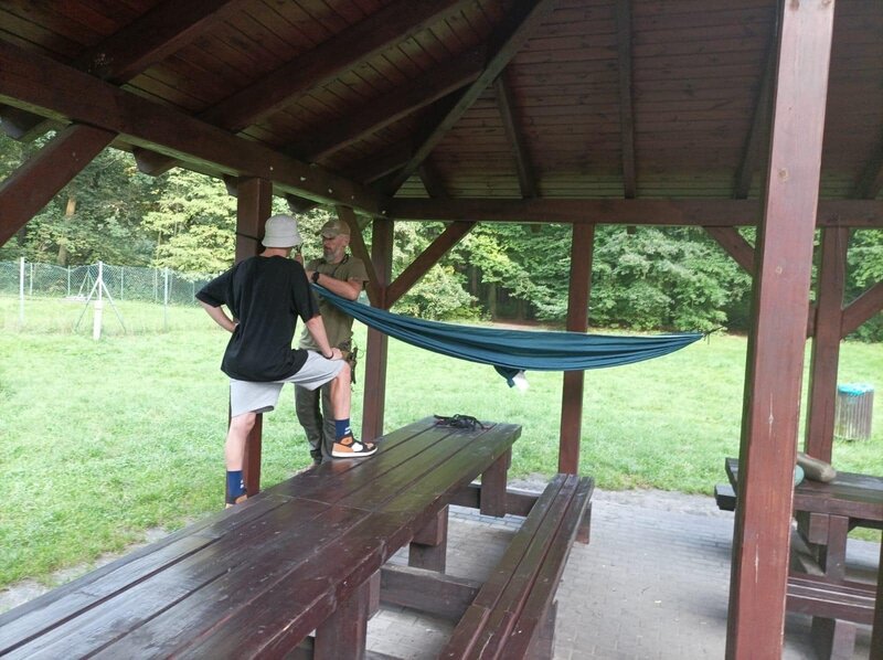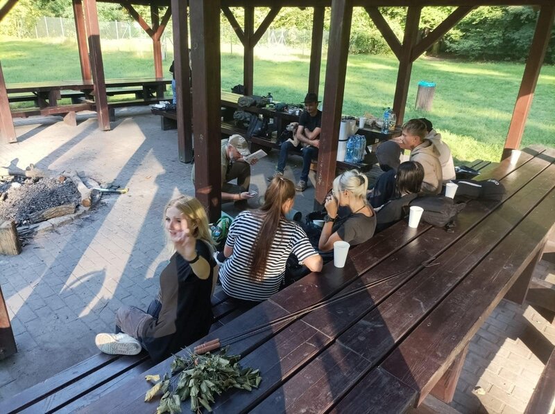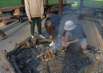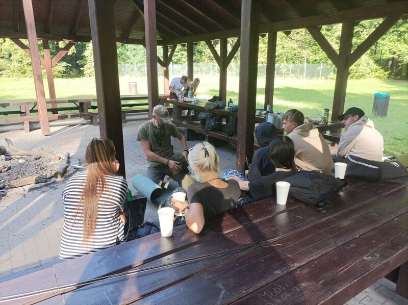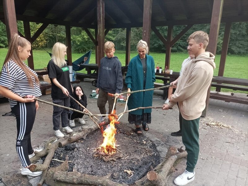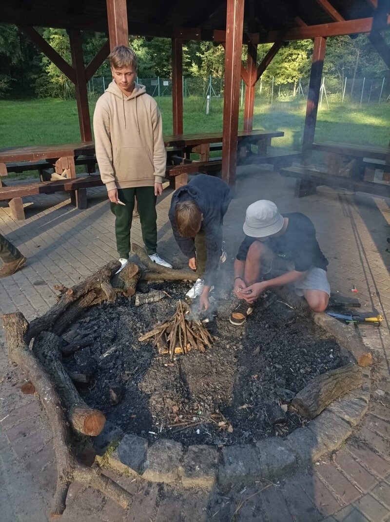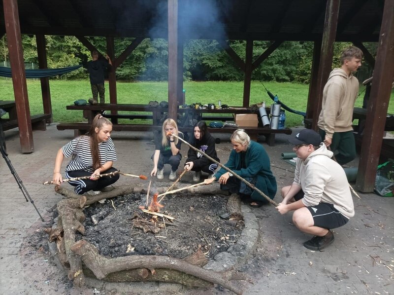 Na zakończenie intensywnego dnia, uczestnicy wspólnie wzięli udział w rozpalaniu ogniska. Atmosfera była pełna radości i entuzjazmu, zwłaszcza gdy wszyscy razem smażyli kiełbaski nad płomieniami. To był czas na relaks, dzielenie się wrażeniami i budowanie więzi między uczestnikami.