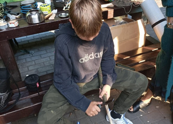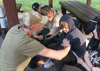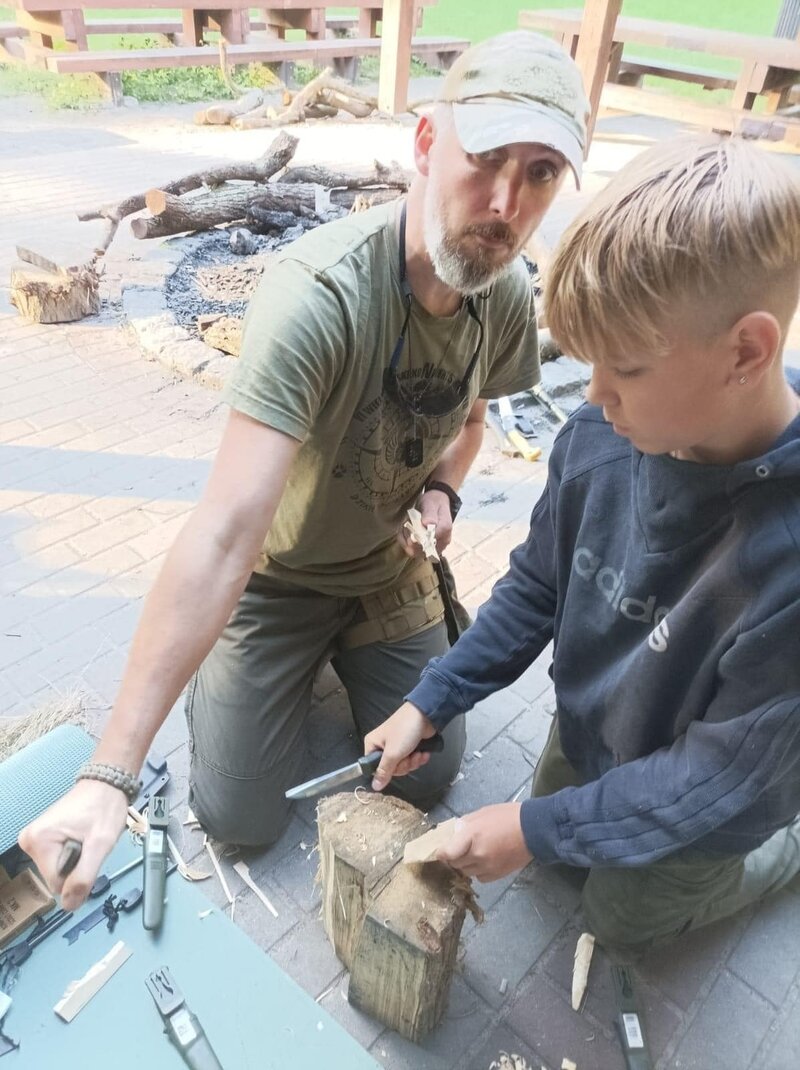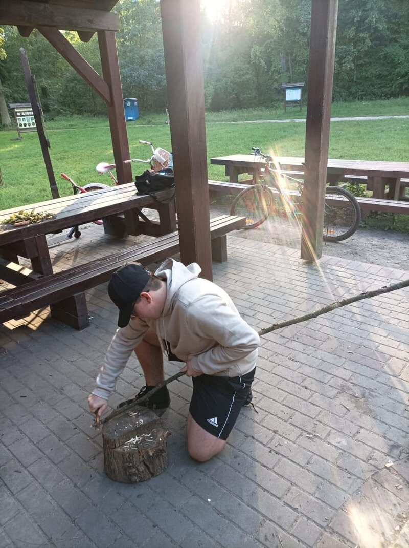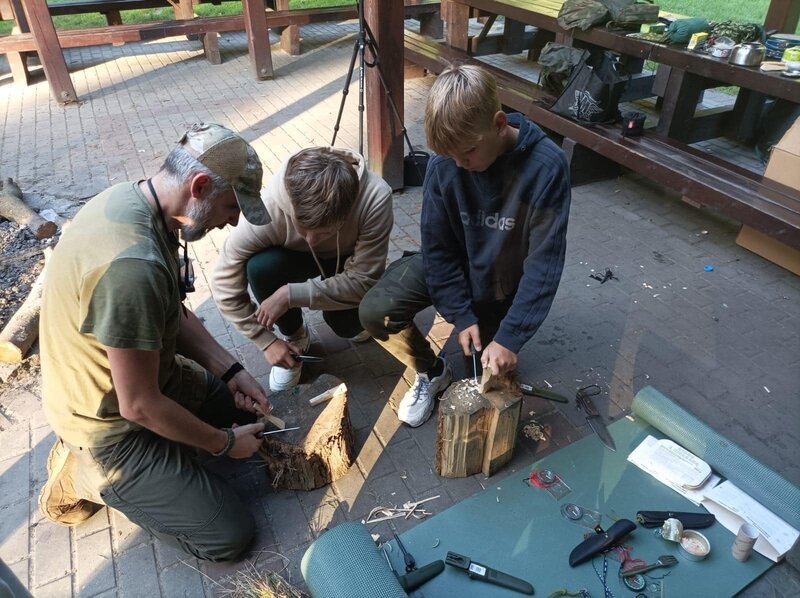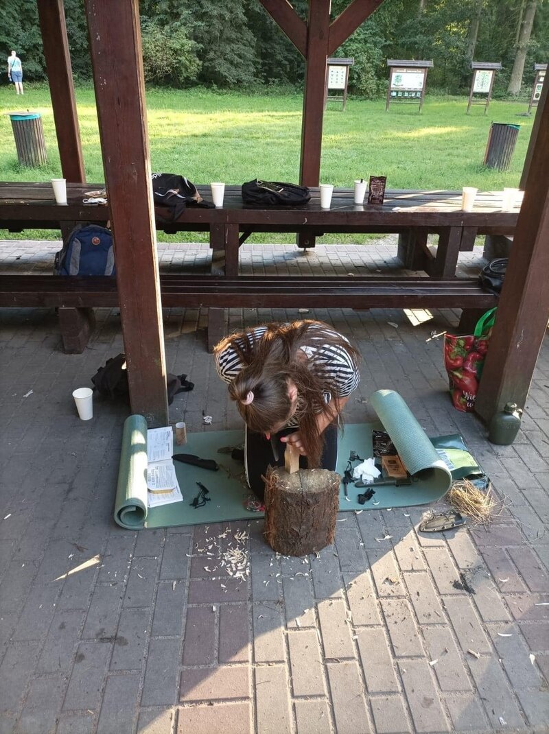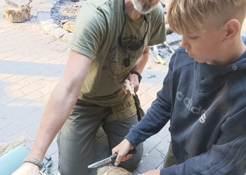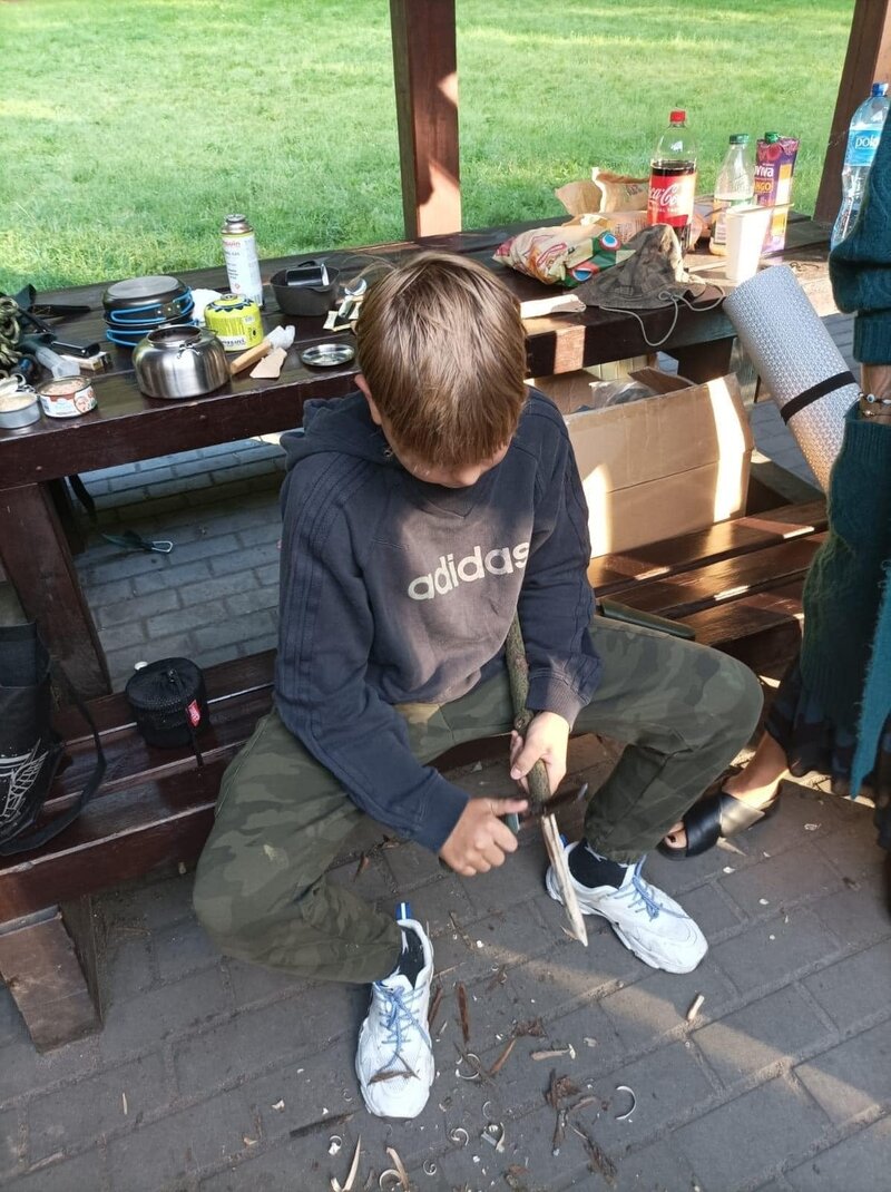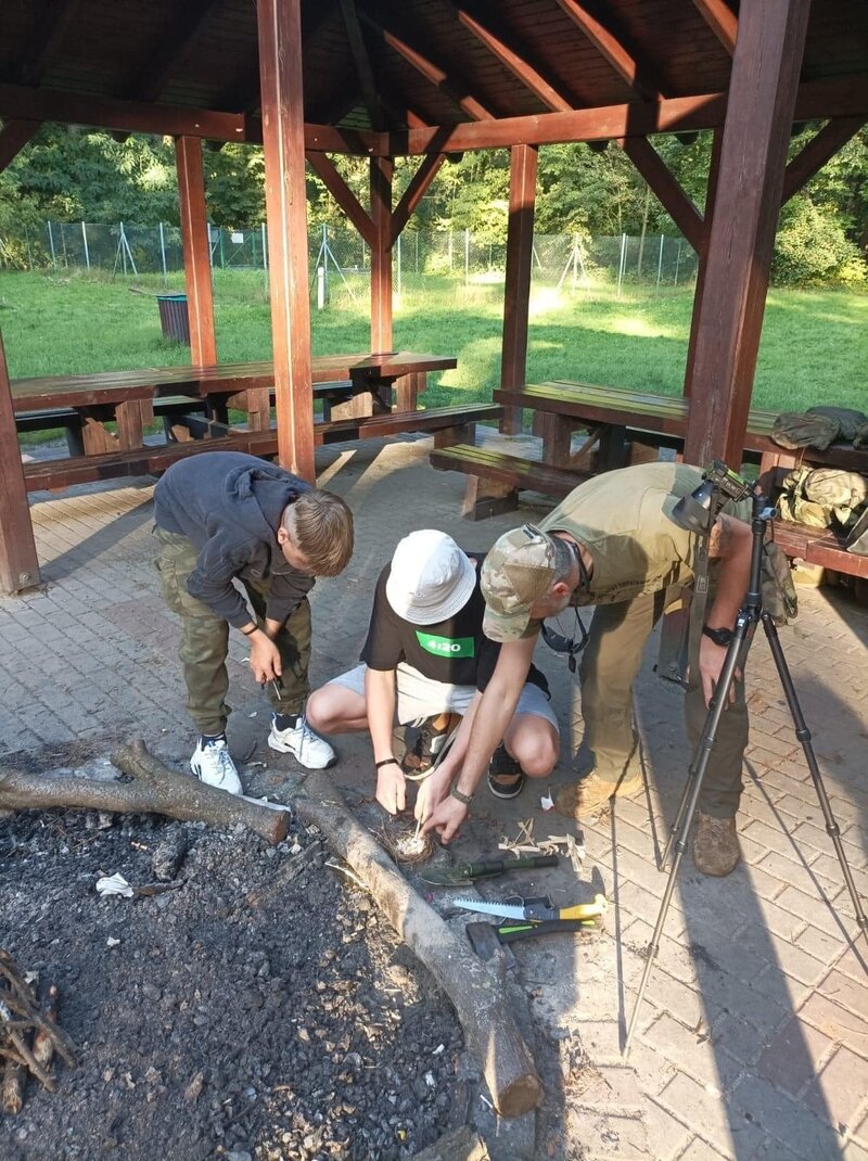 Kolejnym emocjonującym elementem warsztatów było poznanie umiejętności obsługi noża w lesie. Prowadzący warsztaty przekazywali nie tylko techniczne aspekty, ale także podkreślali znaczenie odpowiedzialnego podejścia do narzędzi, które mogą być przydatne w kontaktach z naturą.