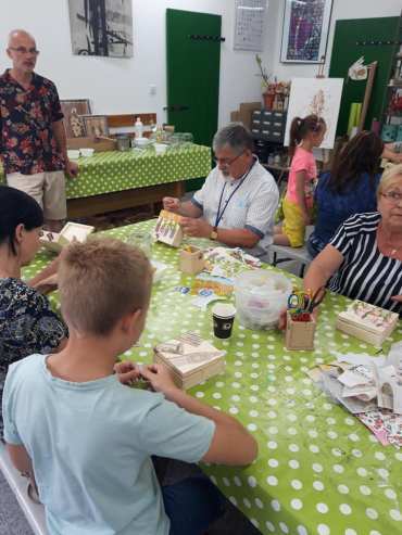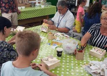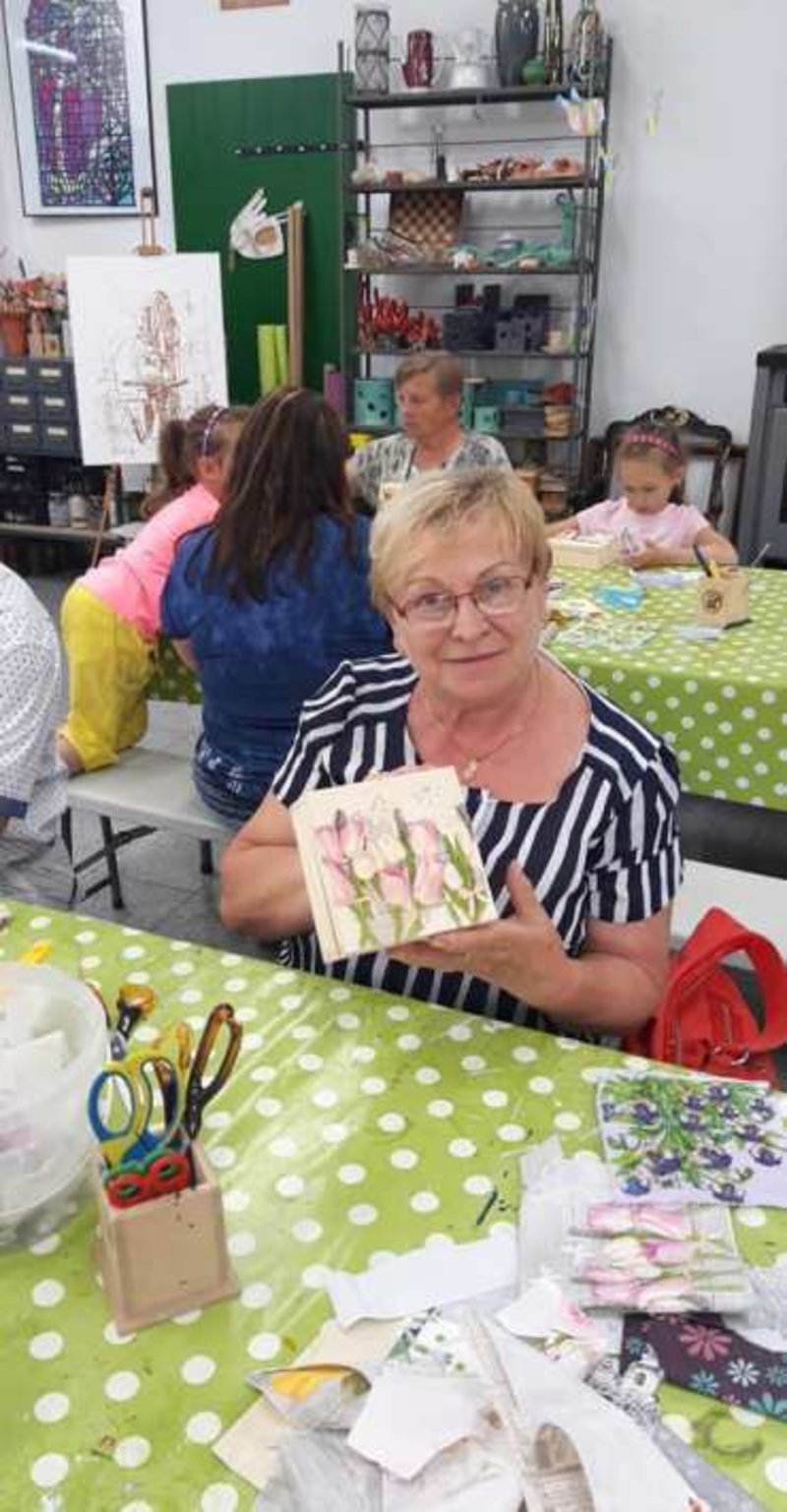 Po zwiedzaniu, uczestnicy udali się na warsztaty artystyczne, podczas których zdobili drewniane szkatułki metodą decoupage. W pracowni unosił się wspaniały aromat domowego ciasta i świeżo parzonej kawy, którymi ugościli wszystkich wspaniali gospodarze obiektu.