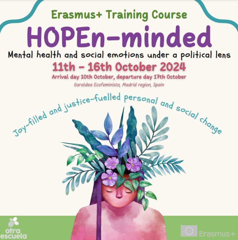 HOPEn-minded to międzynarodowy projekt, który skupia uczestników z krajów takich jak Hiszpania, Francja, Włochy, Malta, Holandia, Palestyna i Polska. Program łączy rozwój osobisty z pracą na rzecz społeczności i kładzie duży nacisk na tematykę zdrowia psychicznego oraz społecznych emocji w kontekście zmian politycznych. Uczestnicy będą pracować w grupie, korzystając z metod edukacji nieformalnej, technik somatycznych oraz refleksji nad rolą wspólnoty w tworzeniu zmian społecznych.