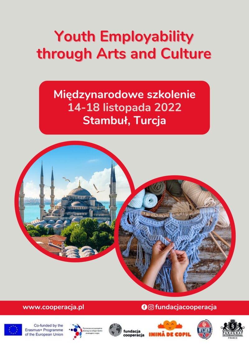 Zapraszamy do udziału w międzynarodowym szkoleniu, które odbędzie się w Stambule (Turcja) w dniach 14-18 listopada 2022 w ramach projektu Erasmus+ pn. "Youth Employability Through Arts and Crafts Course".