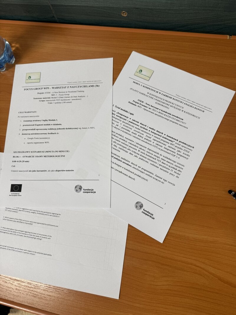 Podczas spotkania skupiono się na Module 3, poświęconym pracy z danymi w kontekście zawodowym. W projekcie STEM nie jest traktowany jako cztery oddzielne przedmioty (biologia, matematyka, fizyka, informatyka), lecz jako jedno zadanie oparte na realnym problemie z pracy lub warsztatu.