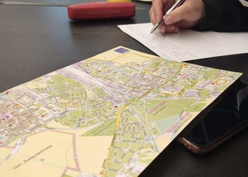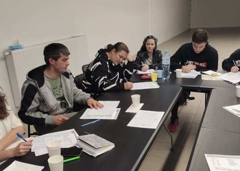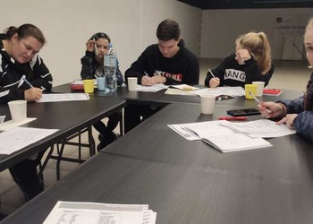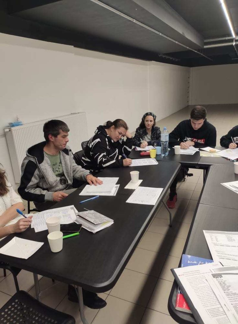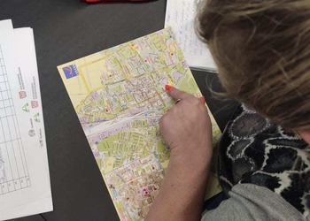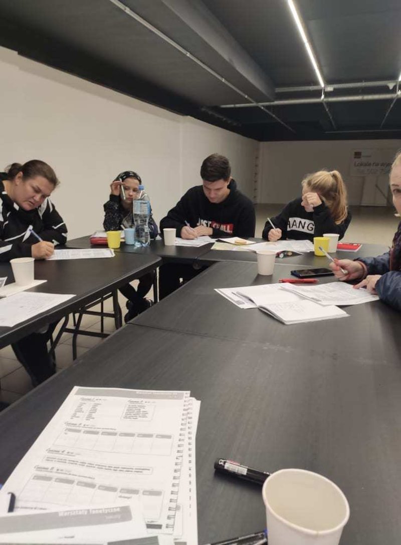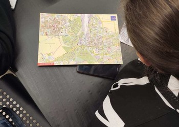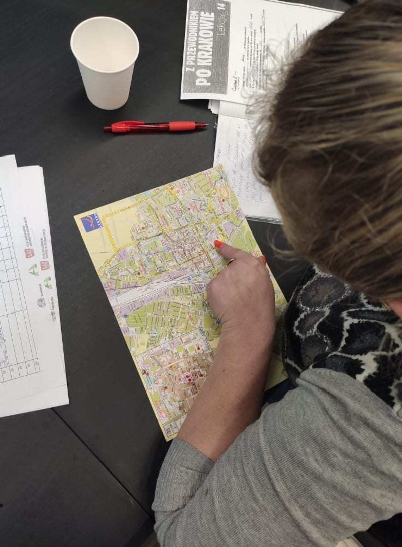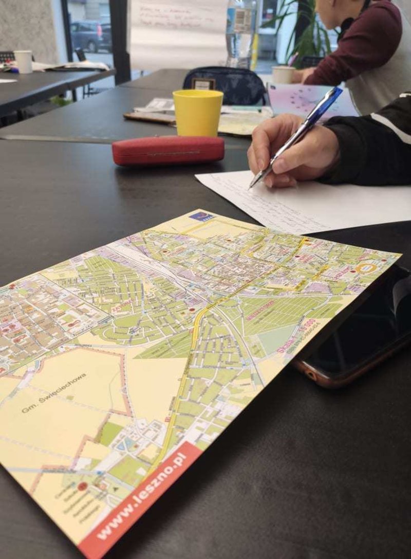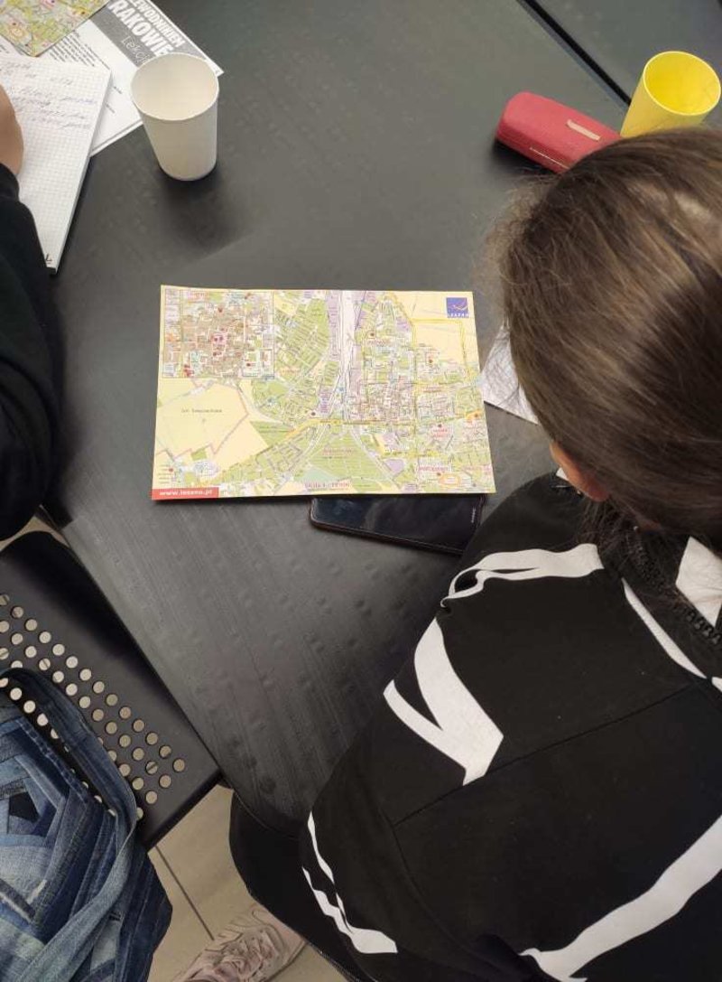 Podczas zajęć dla grupy podstawowej na tapet wzięliśmy słownictwo dotyczące drogi. Każdy dostał mapę Leszna i za jej pomocą kierowaliśmy innych w swoje ulubione miejsca w mieście. Poznaliśmy również różnice między "iść" a "chodzić".